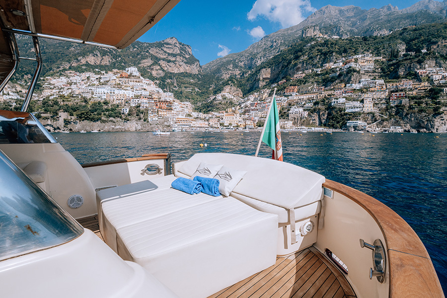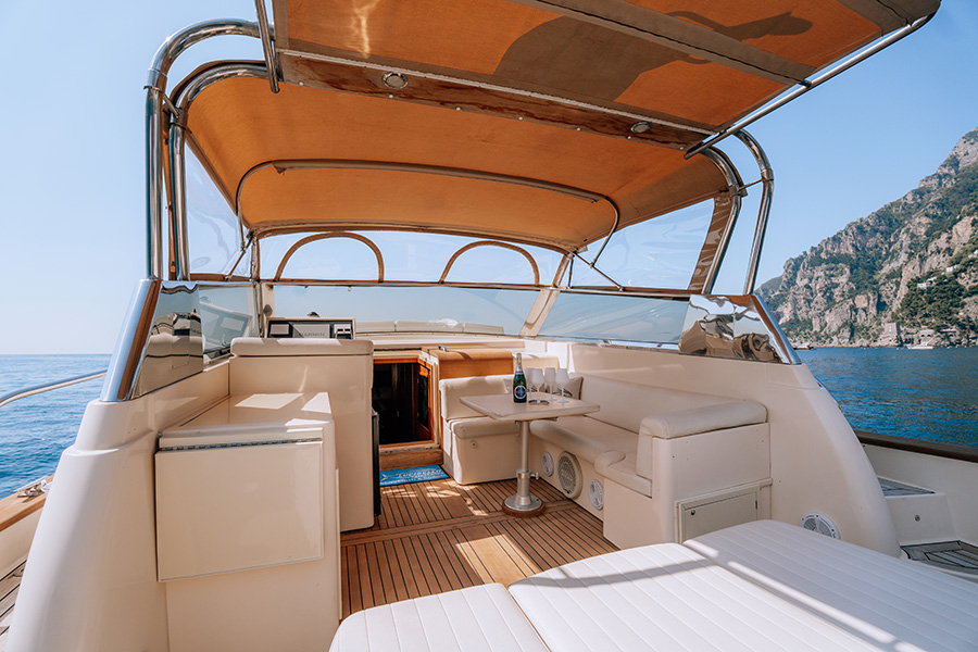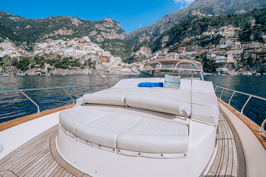 Experience the ultimate relaxation and enjoyment on board Mucho Gusto: plenty of space on board to relax, spend quality time with your loved ones, and take in the beauty of the Amalfi Coast! Lounge on the bench seats or stretch out on the sundeck cushions. Dive into the blue Mediterranean Sea from the spacious swim platform.